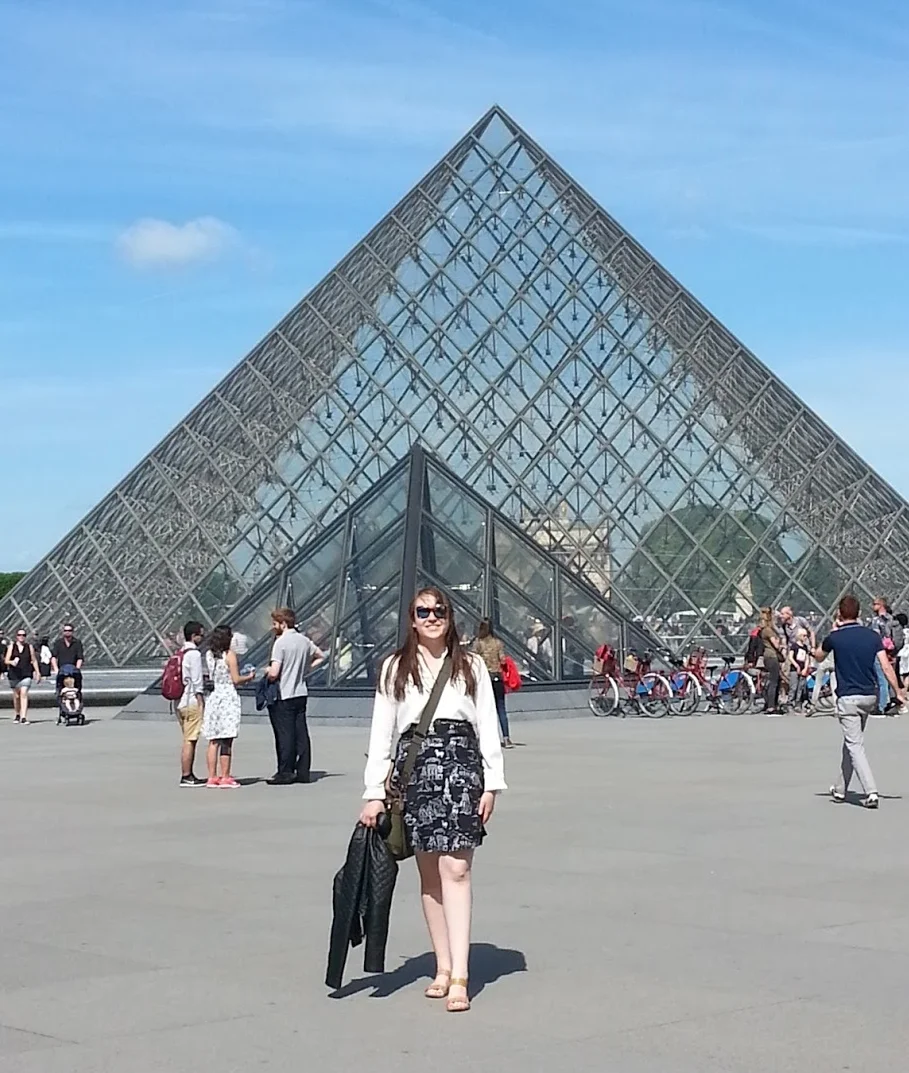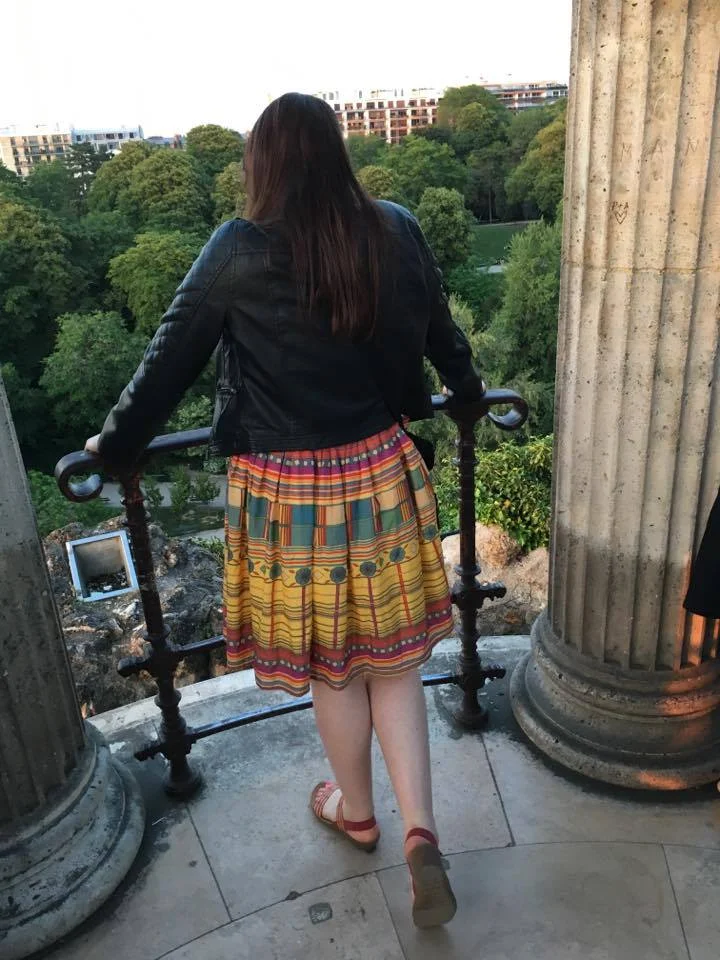 Josie looking out over a scene juxtaposing ancient and modern Paris.