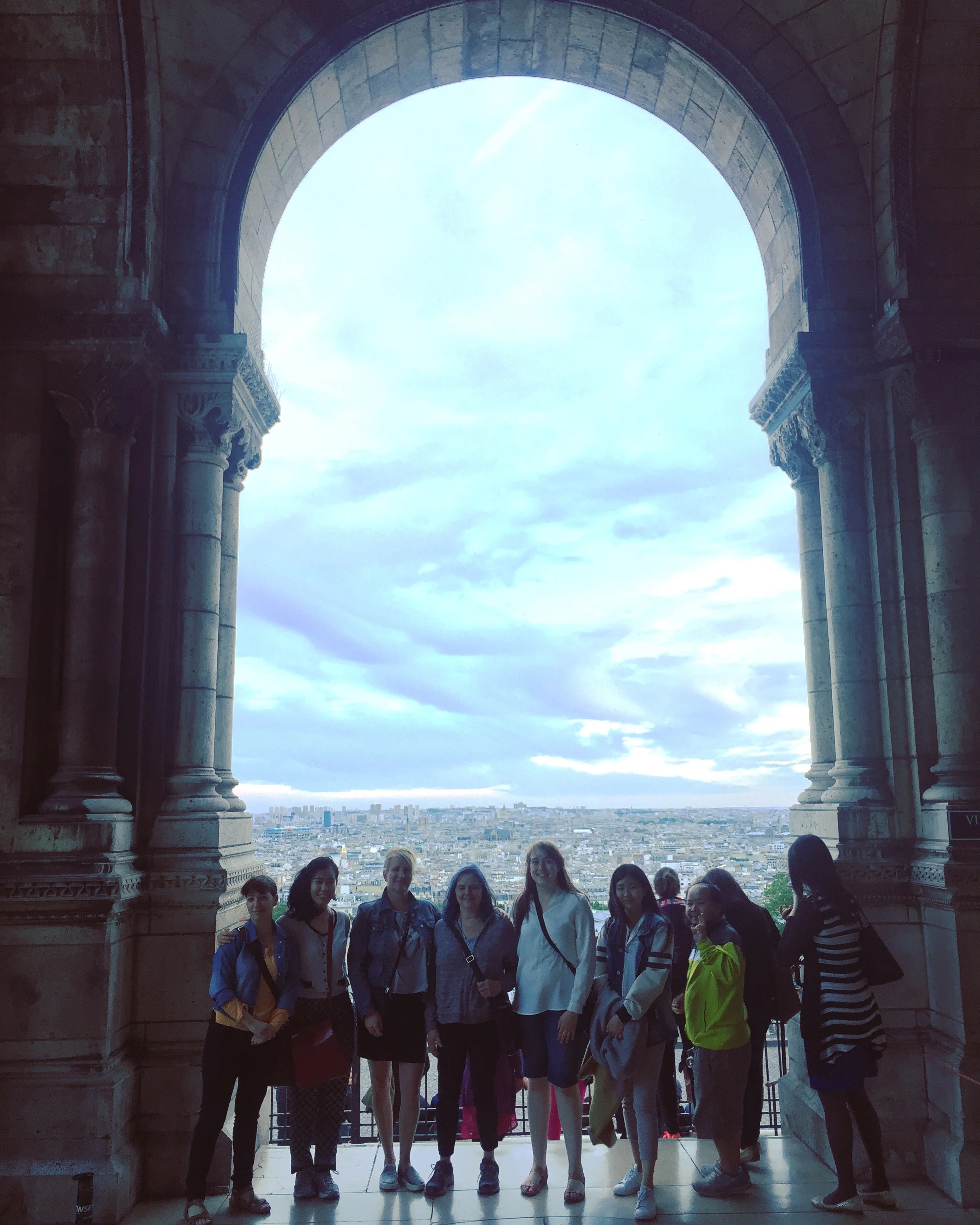 Group picture overlooking the city at sunset from the Sacre Coeur Basilica portico in Montmartre-- Josie at center.
